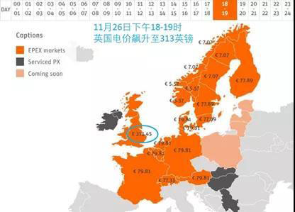 11月25日,英國(guó)國(guó)家電網(wǎng)(National Grid)發(fā)出警告,預(yù)計(jì)26日的電力系統(tǒng)會(huì)面臨供給短缺的風(fēng)險(xiǎn),主要由于氣溫驟降推高電力負(fù)荷,疊加風(fēng)電出力極低,使得系統(tǒng)的負(fù)荷裕度極低,需要更多的備用電源及靈活性措施。面對(duì)供需緊張的形勢(shì),電力現(xiàn)貨市場(chǎng)出現(xiàn)了巨幅波動(dòng),26日傍晚18時(shí)英國(guó)電價(jià)飆升至350歐元(313英鎊)每兆瓦時(shí)。這是同一時(shí)段挪威電價(jià)的70倍。整個(gè)西歐的電價(jià)也都因?yàn)榈惋L(fēng)電下電力供給緊張,而走高至80歐元每兆瓦時(shí)的罕見(jiàn)高價(jià)位。