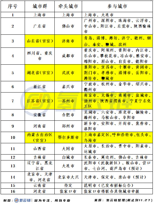 根據(jù)9月16日五部委下發(fā)《關(guān)于開展燃料電池汽車示范應(yīng)用的通知》要求,燃料電池汽車示范應(yīng)用城市群申報已經(jīng)正式截止(截止日為11月15日)。而從之前氫云鏈氫云鏈對各地申報整理的情況來看,在大陸31省市自治區(qū)中,已有超過半數(shù)申報了申報了燃料電池汽車城市群,全國各地都顯示出對燃料電池汽車發(fā)展極大的熱情,具體詳情見表1。