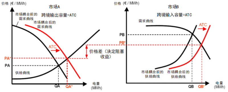 日前市場聯(lián)合出清不考慮各國(價區(qū))內(nèi)部輸電阻塞,僅考慮跨國(價區(qū))之間的輸電線路容量限制。由TSO向電力交易機構發(fā)布跨境傳輸通道的可用傳輸容量(Available Transmission Capacity,ATC)。市場A和市場B的市場成員各自提交報價,使用該傳輸容量作為約束進行統(tǒng)一優(yōu)化出清,得到各自市場的成交電量及價格。在區(qū)域間有阻塞和無阻塞情況下各市場出清曲線如下圖所示: