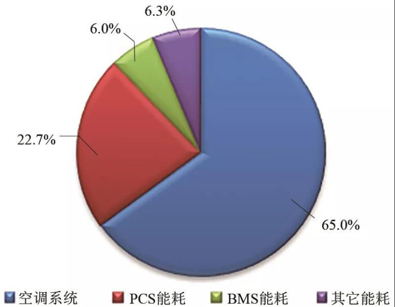 本文以鋰離子電池集裝箱儲(chǔ)能系統(tǒng)為研究對(duì)象,通過(guò)對(duì)實(shí)測(cè)能耗數(shù)據(jù)進(jìn)行分析得出,集裝箱儲(chǔ)能系統(tǒng)運(yùn)行能耗主要包含:空調(diào)系統(tǒng)能耗、PCS能耗、BMS能耗、輔助系統(tǒng)能耗。其中空調(diào)系統(tǒng)能耗與選型設(shè)計(jì)、運(yùn)行策略和風(fēng)道設(shè)計(jì)等相關(guān),系統(tǒng)設(shè)備能耗多與器件選型和電路設(shè)計(jì)有關(guān)。根據(jù)以上數(shù)據(jù)分析,針對(duì)集裝箱不同系統(tǒng)和設(shè)備進(jìn)行降能耗方案的研究,從而提高儲(chǔ)能設(shè)備電力效率。