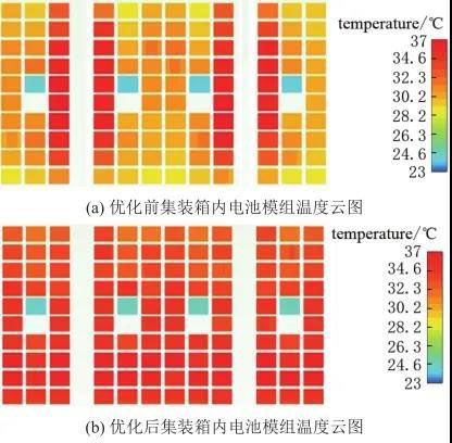 如圖10所示優(yōu)化前后的送風(fēng)風(fēng)道,優(yōu)化后風(fēng)道增加了有效的導(dǎo)風(fēng)板,使風(fēng)量分配更加均勻,仿真結(jié)果顯示:優(yōu)化后電池模組間溫差相比優(yōu)化前降低4.6 ℃,理論計(jì)算:內(nèi)風(fēng)機(jī)運(yùn)行時(shí)間約減少0.33 h,降低系統(tǒng)能耗約0.6%。