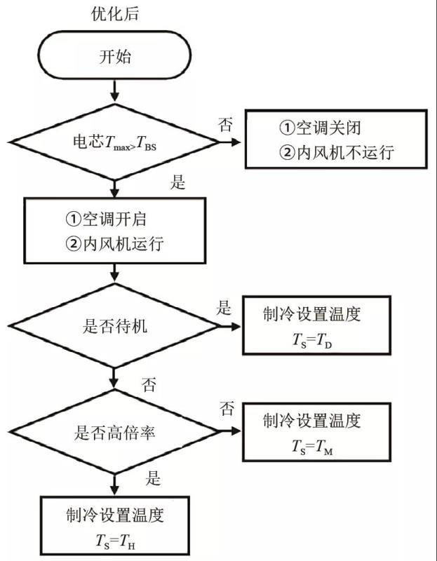 圖8~9中:Tr為空調(diào)回風(fēng)溫度;Ts為空調(diào)設(shè)定溫度;Tmax為電池最高溫度;TBS為空調(diào)開(kāi)啟電池溫度;TD為空調(diào)節(jié)能模式溫度值;TM為空調(diào)普通模式溫度值;TH為空調(diào)高功耗模式溫度值。