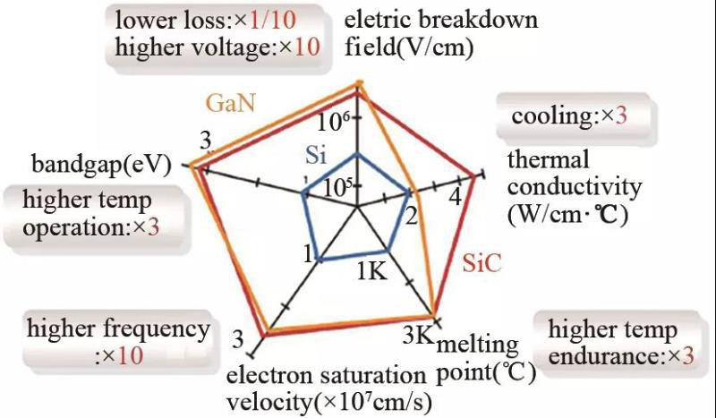 Si基電力電子器件的發(fā)展已經(jīng)達(dá)到Si材料的物料理論極限,為了發(fā)展更高性能的電力電子器件,當(dāng)前國(guó)際上普遍采用碳化硅(SiC)和氮化鎵(GaN)為代表的第三代寬禁半導(dǎo)體材料電力電子器件。相比于傳統(tǒng)Si基電力電子器件,第三代半導(dǎo)體器件具有禁帶寬、擊穿電場(chǎng)強(qiáng)度高、載流子飽和漂移速度高、導(dǎo)熱率高等優(yōu)異的物料特性。