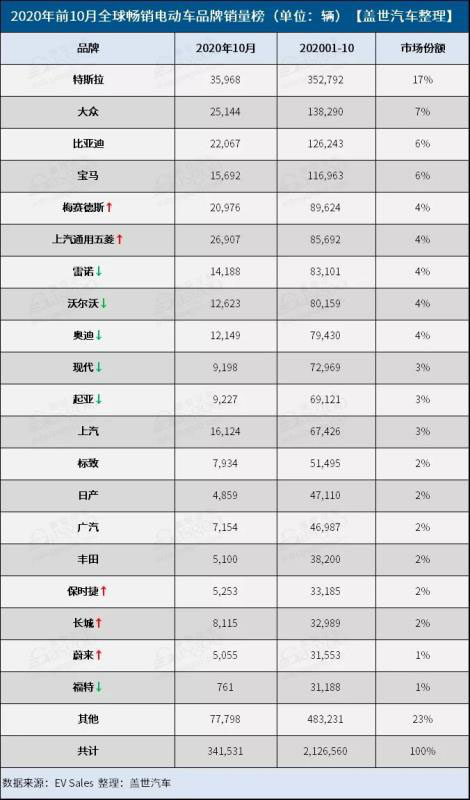 就前十個(gè)月累計(jì)銷量來說,特斯拉仍遙遙領(lǐng)先,領(lǐng)先其他品牌二十余萬輛;大眾和比亞迪分列第二和第三,不過兩者之間僅有1萬余輛的差距,到年底名次是否會(huì)互換還尚不可知;上汽通用五菱進(jìn)步明顯,攀升5名來到第6名,與當(dāng)前第5名梅賽德斯之間僅有不到4,000輛的差距,預(yù)計(jì)到年底上汽通用五菱的名次將繼續(xù)攀升。