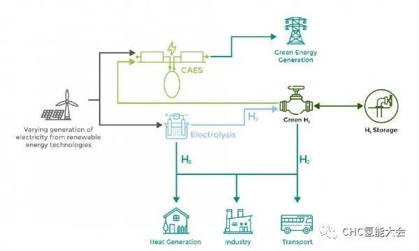 GHH的主要目的是確保可再生能源供應(yīng),不論天氣如何。具體而言,該項目正在研究建立一個350MW的電解廠、200,000MWh的氫儲存和320MW的壓縮空氣儲能設(shè)施的可能性,這些設(shè)施作為這一鏈條的最后一環(huán),可以將綠色氫重新轉(zhuǎn)化為電力。將季節(jié)儲氫和日常儲氫結(jié)合在CAES中,可為用戶提供全年24x7小時的100%綠色電力。換句話說,基于風(fēng)能和太陽能的生產(chǎn),該項目將能夠平衡28萬戶家庭的年用電量。