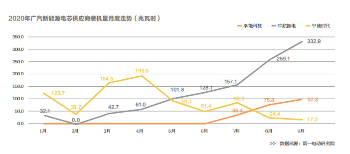 中國汽車動力電池產(chǎn)業(yè)創(chuàng)新聯(lián)盟10月13日發(fā)布的最新數(shù)據(jù)顯示:2020年9月,動力電池裝車量排名前五的企業(yè)分別是寧德時代、比亞迪、中航鋰電、LG化學(xué)、松下,裝車量分別為3.12吉瓦時、1.09吉瓦時、0.49吉瓦時、0.47吉瓦時、0.26吉瓦時;2020年1~9月,動力電池裝車量排名前五名的企業(yè)分別是寧德時代、比亞迪、LG化學(xué)、松下和中航鋰電,裝車量分別為16.75吉瓦時、4.88吉瓦時、3.19吉瓦時、1.96吉瓦時、1.69吉瓦時。