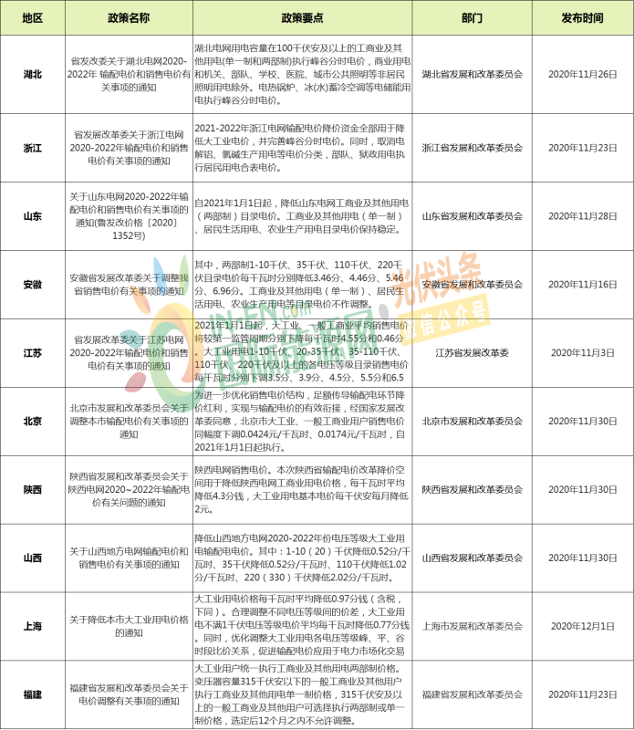 中國儲(chǔ)能網(wǎng)訊:近日,湖北、浙江、山東、安徽、江蘇、北京、陜西、山西、上海、福建10省市發(fā)改委2021年1月1日起開始執(zhí)行最新的電價(jià)。其中,工商業(yè)電價(jià)政策均有調(diào)整。要點(diǎn)如下: