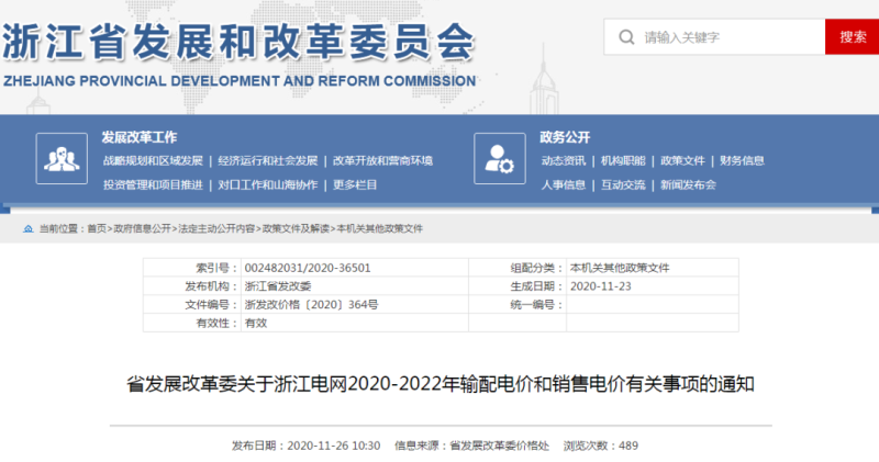 《關(guān)于浙江電網(wǎng)2020-2022年輸配電價(jià)和銷售電價(jià)有關(guān)事項(xiàng)的通知》