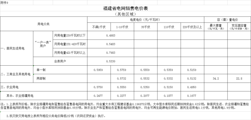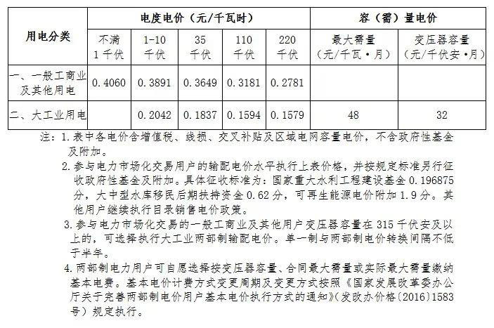 其中,兩部制1-10千伏、35千伏、110千伏、220千伏目錄電價(jià)每千瓦時(shí)分別降低3.46分、4.46分、5.46分、6.96分。工商業(yè)及其他用電(單一制)、居民生活用電、農(nóng)業(yè)生產(chǎn)用電等目錄電價(jià)不作調(diào)整。