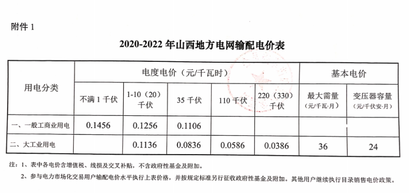 文件指出降低山西地方電網(wǎng)2020-2022年份電壓等級大工業(yè)用電輸配電電價(jià)。其中:1-10(20)千伏降低0.52分/千瓦時(shí)、35千伏降低0.52分/千瓦時(shí)、110千伏降低1.02分/千瓦時(shí)、220(330)千伏降低2.02分/千瓦時(shí)。