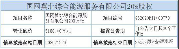 從披露的項(xiàng)目信息來(lái)看,國(guó)網(wǎng)冀北綜合能源服務(wù)有限公司20%股權(quán)轉(zhuǎn)讓底價(jià)為5180萬(wàn)元,信息披露起始日期為2020年12月03日,信息披露結(jié)束日期為2020年12月30日。