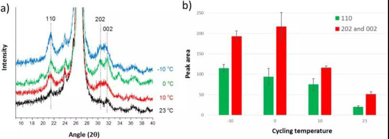圖12. 不同溫度下反復(fù)快速充電前后負(fù)極表面的XRD分析。