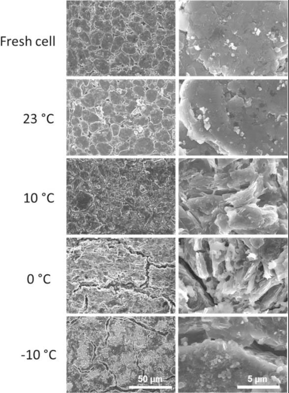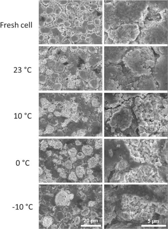圖11. 不同溫度下反復(fù)快速充電前后正極表面的SEM圖像。