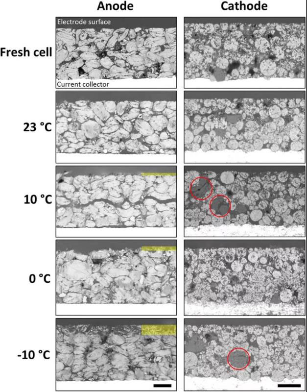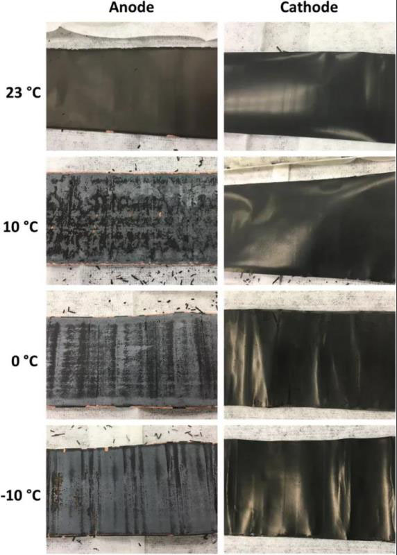 圖8. 在不同溫度下反復(fù)快速充電后正極和負(fù)極的照片。