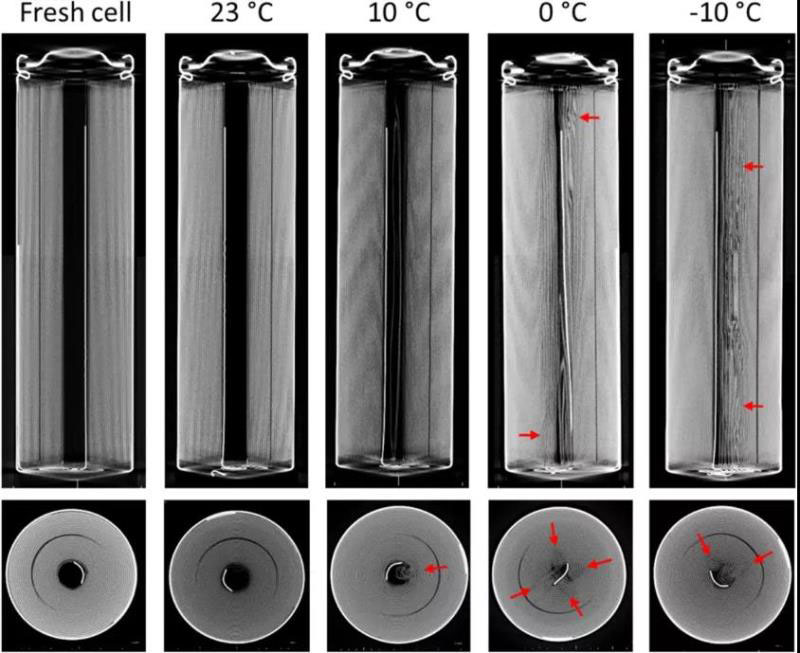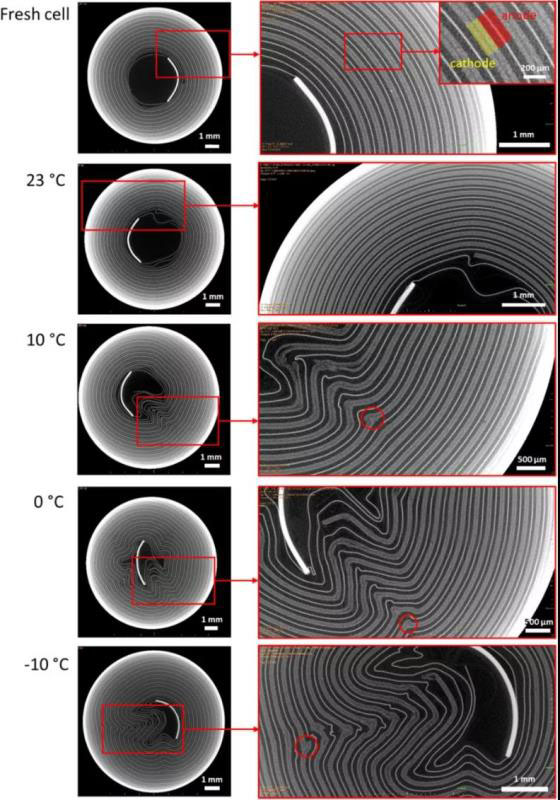 圖6. 電池循環(huán)前(左)和不同溫度下反復(fù)快速充電后的X-CT圖像,縱斷面(上)和軸向斷面(下)。