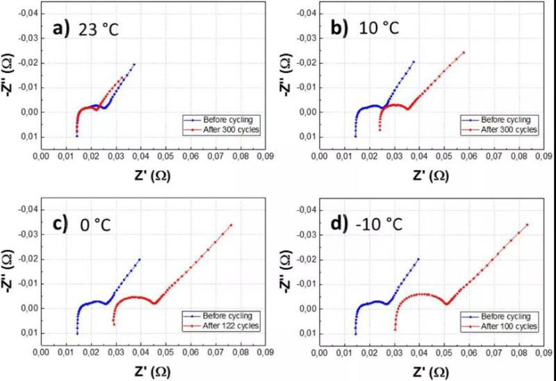 圖4. 電池在不同溫度下循環(huán)前后的EIS圖譜。
