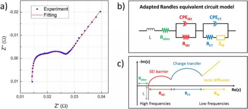 圖3. a) 23℃時(shí)電池的典型EIS圖,及等效電路模型的擬合曲線(xiàn)。b) 等效電路模型。c) 奈奎斯特圖的特征。