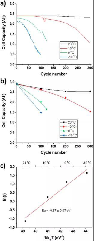 圖2. a) 在不同循環(huán)溫度下,反復(fù)快速充電(2 C充電,C/3放電)中充電容量vs循環(huán)次數(shù)。b) 不同溫度下測(cè)試的電池每100圈循環(huán)后的容量。c) 阿倫尼烏斯圖。
