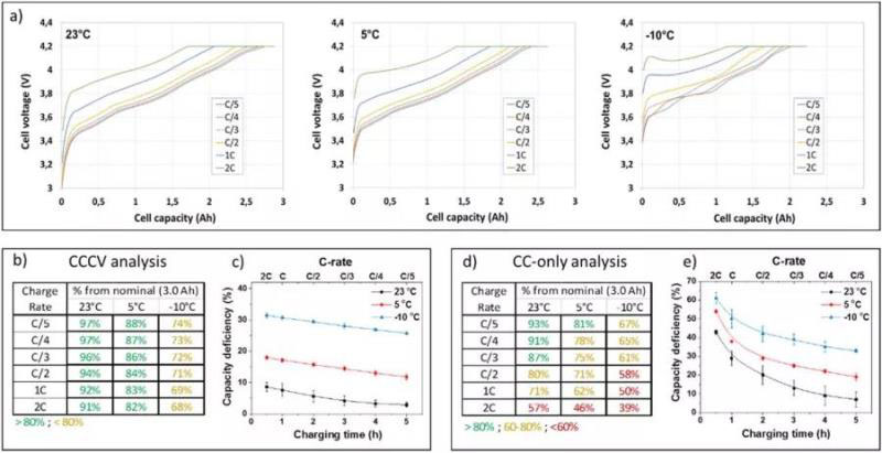 倍率充電性能:表1b和1d所示為CCCV和CC協(xié)議不同倍率條件下釋放容量率,圖1c和1e分別為相對(duì)于標(biāo)稱(chēng)容量的百分比差值。結(jié)果表明,使用CCCV充電方案,電池在5℃及以上的溫度下電池能夠達(dá)到80%的標(biāo)稱(chēng)容量,但在-10℃充電時(shí)未達(dá)到80%的目標(biāo),23℃充電時(shí)容量最佳。圖1c清楚地表明,倍率對(duì)充電容量幾乎沒(méi)有影響,而溫度有顯著影響,低溫明顯限制了可充電容量。然而,不同倍率下充電曲線(xiàn) (如圖1a)存在明顯的差異。當(dāng)電池以高倍率充電時(shí),會(huì)更容易地到達(dá)CV階段,對(duì)長(zhǎng)循環(huán)性能可能存在影響;若僅考慮CC協(xié)議,其容量存在明顯的差異。根據(jù)以上結(jié)果,電池在充電過(guò)程中的行為有明顯的差異,其中溫度和升溫速率似乎都會(huì)顯著影響CC階段。