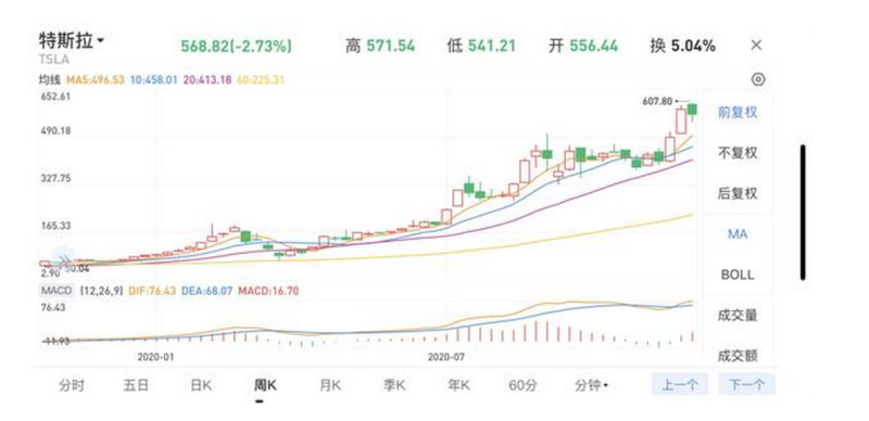 12月4日,雖然受到邁克爾·巴里做空,特斯拉股價翻轉,大漲4.32%,收于593.38美元。12月5日,特斯拉收于599.04美元,離600美元一步之遙,總市值則達到5678億美元。隨著馬斯克頂住了大空頭的第一波攻擊,高盛將特斯拉股票評級從中性上調(diào)至買入,并將目標價從455美元上調(diào)至780美元。