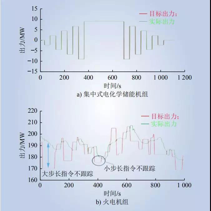(1)研究?jī)?chǔ)能調(diào)節(jié)資源的控制特性,基于儲(chǔ)能與常規(guī)火電機(jī)組特性的對(duì)比如圖1所示??梢钥闯?,儲(chǔ)能出力響應(yīng)呈現(xiàn)階躍式變化,與火電機(jī)組幾十s至min級(jí)別的逐步爬升過程差異較大;儲(chǔ)能可以穩(wěn)定地保持在目標(biāo)功率出力,但火電機(jī)組的調(diào)節(jié)偏差比較明顯;儲(chǔ)能實(shí)際出力與給定出力曲線近乎相似重合,而傳統(tǒng)火電機(jī)組的調(diào)節(jié)曲線有明顯延遲和偏差。