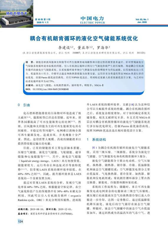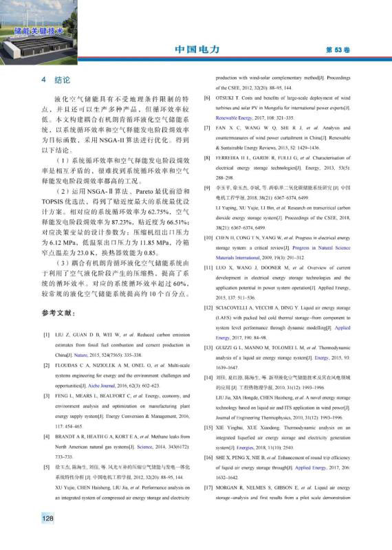 儲能是解決風能和太陽能等可再生能源發(fā)電間歇性和不穩(wěn)定性的重要技術(shù)途徑。針對常規(guī)液化空氣儲能系統(tǒng)循環(huán)效率較低的問題,引入有機朗肯循環(huán)以利用空氣液化階段產(chǎn)生的壓縮熱。構(gòu)建耦合有機朗肯循環(huán)的液化空氣儲能系統(tǒng),以系統(tǒng)循環(huán)效率和空氣釋能發(fā)電階段?效率為目標函數(shù),以壓縮機組出口壓力、低溫泵出口壓力、冷箱窄點溫差和換熱器效能為決策變量,運用非劣分類遺傳算法NSGA-Ⅱ進行多目標優(yōu)化。繪制Pareto最優(yōu)前沿曲線,采用TOPSIS優(yōu)選法,得到貼近度最大的系統(tǒng)最優(yōu)設計方案,與之對應的系統(tǒng)循環(huán)效率為62.75%。