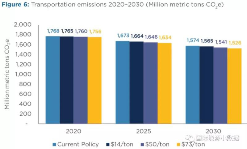 第二,碳稅對電力部門的煤電廠影響最大(煤電廠加速退役),到2030年因為碳稅實現(xiàn)的減排量中80%來自電力部門。如果碳稅為50美元/噸,那么2030年電力部門碳排放為6.76億噸,比沒有碳稅的情境下的排放量降幅達61%。而50美元/噸的碳稅對于交通部門的減排量影響非常?。?2%)。