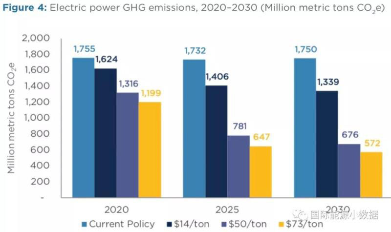 第一,碳稅有助于減排,但是需要達到較高的碳價水平才能充分發(fā)揮作用。如果碳稅達到50美元/噸的時候,美國2025年代碳排放量將比2005年下降39%-46%(美國奧巴馬政府的減排目標是26%-28%)。如果2050年代減排目標是比2005年下降80%,那么屆時碳稅需要超過100美元/噸。