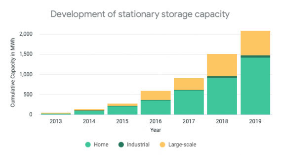 到2019年底,德國住宅儲能、商業(yè)和工業(yè)(C&I)以及大規(guī)模并網(wǎng)的儲能應(yīng)用中累計(jì)部署了儲能容量約2.1GWh電池儲能系統(tǒng)。