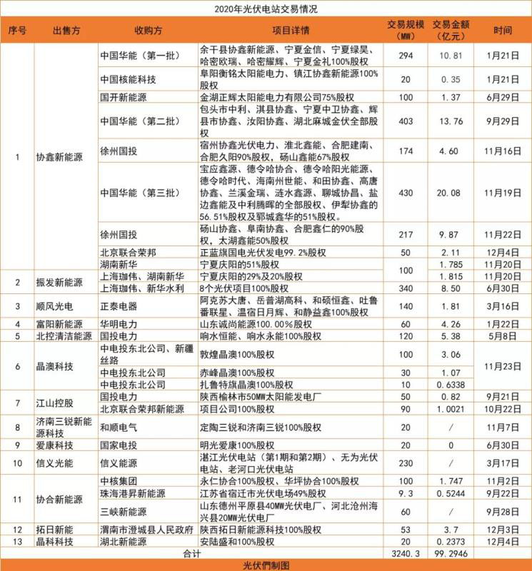 中國儲能網(wǎng)訊:補貼拖欠帶來的惡性循環(huán)仍充斥在光伏行業(yè)中,為保住現(xiàn)金流、減少負債,大部分的光伏電站運營商只能寄希望于出售電站。據(jù)光伏們不完全統(tǒng)計,截止2020年12月4日,共有13家企業(yè)出售了約3.24GW光伏電站,達成了近百億買賣。