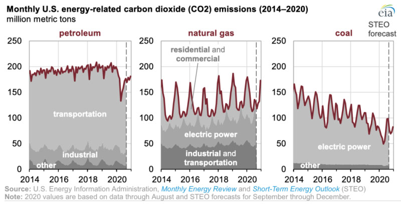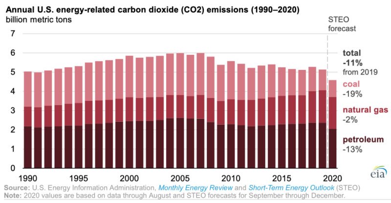 根據(jù)美國能源信息署(EIA)截至8月的數(shù)據(jù)和EIA對9月至12月的估計,2020年美國能源部門的二氧化碳(CO2)排放量可能比2019年低11%。