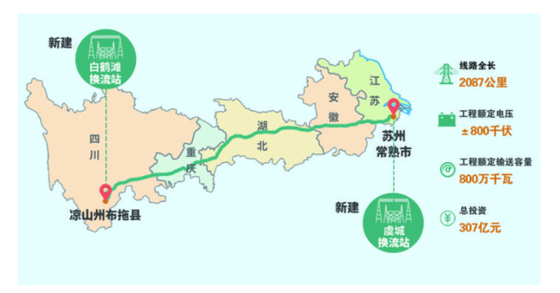 白鶴灘—江蘇工程起于四川省涼山州布拖縣,止于江蘇省蘇州常熟市,途經(jīng)四川、重慶、湖北、安徽、江蘇5?。ㄖ陛犑校€路跨越岷江、漢江和長(zhǎng)江,途經(jīng)高海拔、重覆冰地區(qū),全長(zhǎng)2087公里,新建白鶴灘、虞城2座換流站。工程額定輸送容量800萬(wàn)千瓦,總投資307億元,計(jì)劃于2022年建成投運(yùn)。工程全面集成特高壓直流和柔性直流輸電技術(shù)優(yōu)勢(shì),在世界上首次采用混合級(jí)聯(lián)直流輸電新技術(shù),大幅提升華東電網(wǎng)受電能力,提高電網(wǎng)安全穩(wěn)定運(yùn)行水平。
