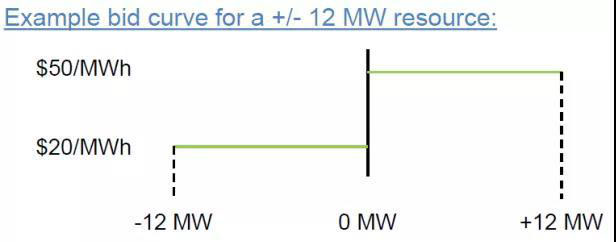 在電能量市場上,電儲能NGR可以提交電能量報價曲線,包括充電報價(-MW)和放電報價(+MW)(如下圖),這種報價曲線允許電儲能在一個單獨(dú)的報價中,反映其經(jīng)濟(jì)可行的運(yùn)行區(qū)間,儲能可以作為發(fā)電、負(fù)荷或者兩者同時參與市場。此外,電儲能也可以提交“價差報價”(spread bid)在電價處于報價區(qū)間之外進(jìn)行充電放電;或者自調(diào)度,只報量作為價格接受者。