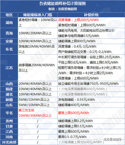 近期湖南、青海、華北對(duì)儲(chǔ)能參與調(diào)峰輔助服務(wù)市場(chǎng)規(guī)則做了調(diào)整。青海、湖南儲(chǔ)能調(diào)峰申報(bào)價(jià)格下降,華北上調(diào)第三方獨(dú)立主體參與調(diào)峰申報(bào)價(jià)格的同時(shí)、提高了儲(chǔ)能電站儲(chǔ)能功率和儲(chǔ)能容量規(guī)模。