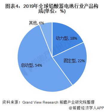 從產(chǎn)品構(gòu)成來看,目前全球鉛酸蓄電池中,啟動(dòng)型鉛酸蓄電池占比最大,根據(jù)Grand View Research公布的數(shù)據(jù)顯示,2019年全球啟動(dòng)型鉛酸蓄電池市場規(guī)模占比達(dá)54%,固定型鉛酸蓄電池規(guī)模占比為22%,動(dòng)力型鉛酸蓄電池規(guī)模占比為18%。