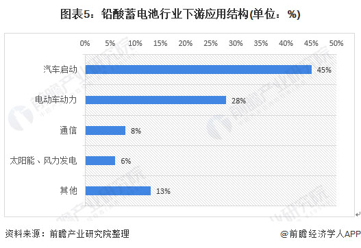 汽車起動(dòng)領(lǐng)域?qū)︺U蓄電池的需求占比最大,需求占比達(dá)45%
