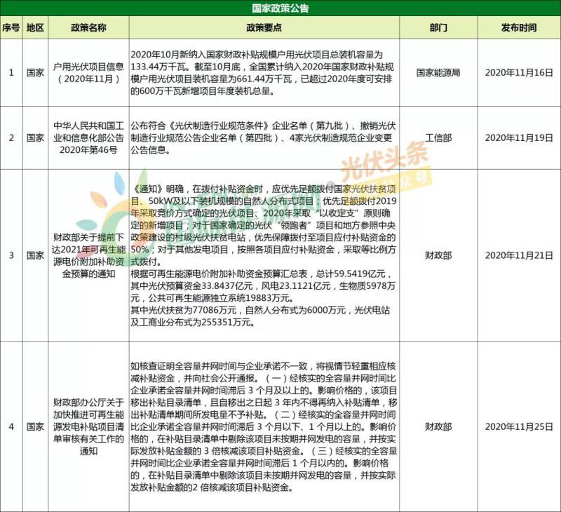 國家:出臺(tái)光伏相關(guān)新政策4條。國際能源網(wǎng)/光伏頭條關(guān)注到,11月,國家能源局發(fā)布《戶用光伏項(xiàng)目信息(2020年11月)》指出, 2020年10月新納入國家財(cái)政補(bǔ)貼規(guī)模戶用光伏項(xiàng)目總裝機(jī)容量為133.44萬千瓦。