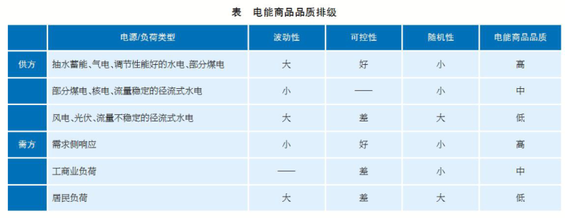 由于電能難以大量?jī)?chǔ)存,發(fā)用功率需要實(shí)時(shí)平衡,從對(duì)電力系統(tǒng)調(diào)度運(yùn)行和功率平衡的影響,筆者認(rèn)為電能商品品質(zhì)應(yīng)從(波動(dòng)性、可控性、隨機(jī)性)3個(gè)維度進(jìn)行衡量(見(jiàn)表)。其中波動(dòng)性指功率相對(duì)于自身容量的變化幅度;可控性指將功率在一定范圍內(nèi)自由調(diào)節(jié)的難易程度;隨機(jī)性與可控性有一定的關(guān)聯(lián),隨機(jī)性大的電源或負(fù)荷一定難于控制,而隨機(jī)性小的電源或負(fù)荷可能易控(可靈活調(diào)節(jié)的資源),也可能難控(功率相對(duì)固定的資源)。對(duì)當(dāng)前各類常見(jiàn)供方(電廠)所生產(chǎn)和需方(負(fù)荷)所消費(fèi)的電能商品品質(zhì)可以給出表中所示的排級(jí)。注意這里是對(duì)電能商品的品質(zhì)進(jìn)行排級(jí),而非給電源或負(fù)荷“貼標(biāo)簽”,僅按一般情況依照電能商品品質(zhì)高低對(duì)電源和負(fù)荷進(jìn)行大致分類,而具體情況需要具體分析。例如,如果品質(zhì)一般的煤電經(jīng)過(guò)靈活性改造,可升級(jí)為高品質(zhì)的調(diào)峰電源。需要說(shuō)明的是,電能商品品質(zhì)是從保證電力系統(tǒng)發(fā)用功率平衡的角度來(lái)定義的,因此對(duì)于電能商品的供方(生產(chǎn)者)和需方(消費(fèi)者),商品品質(zhì)的價(jià)值內(nèi)涵是不同的。從定價(jià)原則來(lái)講,對(duì)于供方,電能商品品質(zhì)越高,定價(jià)越高;對(duì)于需方,電能商品品質(zhì)越高,定價(jià)越低(即價(jià)格越優(yōu)惠),甚至可以享受負(fù)電價(jià)。也就是說(shuō),供方所生產(chǎn)的低品質(zhì)電能商品(如風(fēng)電)可以較低價(jià)提供需方的高品質(zhì)電能商品消費(fèi)(如需求側(cè)響應(yīng)),反之亦然。