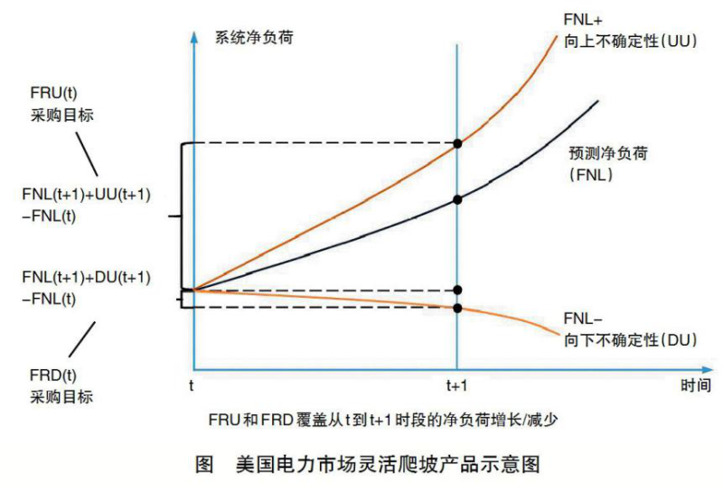 在美國(guó)加州電力市場(chǎng)(CAISO)和中部大陸電力市場(chǎng)(MISO),建立了靈活爬坡產(chǎn)品(Flexible Ramping Product)交易,取得了良好的效果。如圖所示,深藍(lán)色曲線表示預(yù)測(cè)凈負(fù)荷(FNL),即系統(tǒng)總負(fù)荷減去可再生能源發(fā)電出力。由于新能源功率預(yù)測(cè)的不確定性,取概率為95%的置信區(qū)間,最大預(yù)測(cè)凈負(fù)荷可增加至(FNL+),其中包括了向上不確定性UU;而最小預(yù)測(cè)凈負(fù)荷可減小至(FNL-),其中包括了向下不確定性DU。在第t時(shí)段采購(gòu)靈活爬坡產(chǎn)品,要覆蓋從t到t+1時(shí)段的凈負(fù)荷增長(zhǎng)/減少,則需采購(gòu)的向上靈活爬坡產(chǎn)品為FRU(t)=FNL(t+1)+UU(t+1)-FNL(t),需采購(gòu)的向下靈活爬坡產(chǎn)品為FRD(t)=FNL(t+1)+DU(t+1)-FNL(t)。靈活爬坡產(chǎn)品與能量(現(xiàn)貨)及備用聯(lián)合出清,與實(shí)時(shí)備用類似,基于機(jī)會(huì)成本確定出清價(jià)。