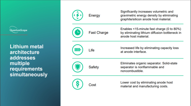 對此問題,QuantumScape采取的方法是鋰金屬固態(tài)電。顧名思義,固態(tài)電池不使用液體電解質(zhì),能夠降低電池起火的風(fēng)險,且與鋰離子電池相比,單位體積的能量更大,充電更快并且更安全。