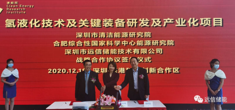 中國儲(chǔ)能網(wǎng)訊:近日,深圳市遠(yuǎn)信儲(chǔ)能技術(shù)有限公司(以下簡稱“遠(yuǎn)信儲(chǔ)能”)與合肥綜合性國家科學(xué)中心能源研究院(以下簡稱“能源研究院”)、深圳市合眾清潔能源研究院(以下簡稱“清能院”)在深圳深港科技創(chuàng)新合作區(qū)共同簽署“氫液化技術(shù)及關(guān)鍵裝備研發(fā)及產(chǎn)業(yè)化項(xiàng)目合作協(xié)議”,中國工程院院士、能源研究院院長李建剛、清能院常務(wù)副院長楊曉峰出席簽約儀式。