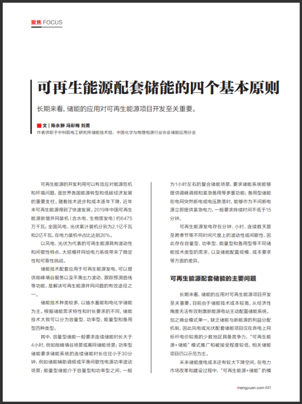 可再生能源發(fā)電在電力系統(tǒng)中的占比會持續(xù)增加,儲能系統(tǒng)的配置可以有效解決棄風(fēng)棄光及可再生能源并網(wǎng)帶來的電力系統(tǒng)穩(wěn)定性和靈活性問題。目前儲能成本較高、收益模式尚不完善,可再生能源配套儲能尚處于初期探索階段。儲能系統(tǒng)在可再生能源發(fā)電中的應(yīng)用首先是解決波動性問題,未來成本下降后可進(jìn)一步解決可再生能源發(fā)電的間歇性問題。可再生能源配套儲能的發(fā)展過程中,建議遵循上述四個基本原則,以避免盲目性和資源浪費(fèi),促進(jìn)儲能產(chǎn)業(yè)的健康發(fā)展。