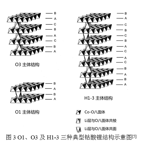 G.Ceder等[5]發(fā)現(xiàn),O3相鈷酸鋰向O1相CoO2轉(zhuǎn)變過(guò)程中,存在H1-3的過(guò)渡相,該相與O1相及O3相的主要區(qū)別在于Li層的氧八面體與Co層氧八面體的連接方式。O1相結(jié)構(gòu)中,Li層與Co層氧八面體是共面,而O3結(jié)構(gòu)中,兩種八面體為共棱;H1-3結(jié)構(gòu)為共面結(jié)構(gòu)與共棱結(jié)構(gòu)交替排布。圖3為O1、O3及H1-3三種典型鈷酸鋰結(jié)構(gòu)示意圖。