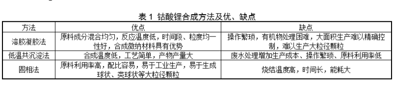 合成鈷酸鋰的常用方法有溶膠凝膠法、低溫共沉淀法及高溫固相法等。表1為鈷酸鋰合成方法及優(yōu)缺點(diǎn)。AbdulAziz等[6]通過(guò)溶膠凝膠法制備鈷酸鋰,應(yīng)用在硝酸鋰的水性電解液電池中也具有較高的初始比容量115.49mAh/g。Wu等[7]采用低溫共沉淀法合成鈷酸鋰,在3.0~4.5 V@1.0 C,100次循環(huán)可逆比容量為148 mAh/g。