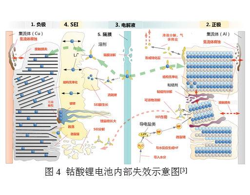 由于正極材料本身的局限性,高電壓下過(guò)量脫鋰導(dǎo)致層狀結(jié)構(gòu)不穩(wěn)定,產(chǎn)生體相結(jié)構(gòu)變化,伴隨著相變和體積變化,使得晶胞參數(shù)變化、晶界錯(cuò)位、應(yīng)力變化、顆粒開裂,導(dǎo)致容量快速衰減;體相結(jié)構(gòu)體積變化影響到表面結(jié)構(gòu)變化,使得表面易產(chǎn)生裂紋,導(dǎo)致表面熱穩(wěn)定性減弱、金屬溶解、析氧等;表面結(jié)構(gòu)的變化伴隨著界面副反應(yīng)及氧的轉(zhuǎn)移,使得電解液氧化、內(nèi)阻增加、產(chǎn)氣、熱穩(wěn)定及安全性能下降等,導(dǎo)致一系列宏觀電池失效行為。在高電壓下相變的可逆程度是決定鈷酸鋰應(yīng)用的關(guān)鍵,而期望用單一的方法解決高壓鈷酸鋰的問(wèn)題是不現(xiàn)實(shí)的。結(jié)合有效摻雜、共包覆、高壓電解液及新功能隔膜配套使用來(lái)緩解鈷酸鋰電池內(nèi)部失效,從而改善高壓鈷酸鋰[3]。圖4為鈷酸鋰電池內(nèi)部失效示意圖。
