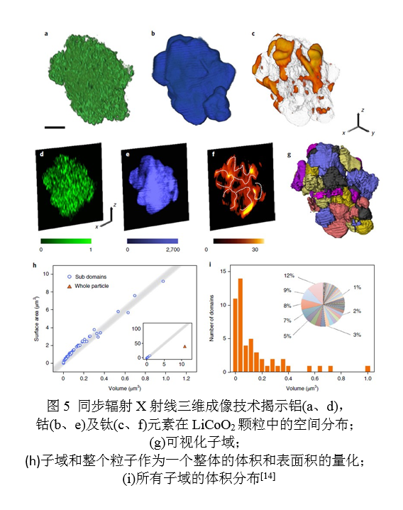 體相摻雜能夠穩(wěn)定材料結(jié)構(gòu),抑制不可逆相變,提高材料循環(huán)性能。體相摻雜包含:(1)低價(jià)陽(yáng)離子摻雜:低價(jià)陽(yáng)離子通常指價(jià)態(tài)不高于正三價(jià)的離子,主要有鋰空位、鋰離子、鎂離子、鋁離子、鋯離子等。A.R.West等[8]首次將鎂離子引入到鈷酸鋰中,認(rèn)為鎂離子摻雜更傾向于鈷的位置,使得鈷的價(jià)態(tài)提高,產(chǎn)生一種導(dǎo)入型P型半導(dǎo)體摻雜,同時(shí)產(chǎn)生部分鋰空位,能夠在一定程度上提高電子電導(dǎo),其研究成果對(duì)后續(xù)鎂離子摻雜起到引導(dǎo)作用。Delmas等[9]認(rèn)為只有鎂摻雜達(dá)到一定的量才能形成連續(xù)通道,表現(xiàn)出金屬特性區(qū)域,才會(huì)反應(yīng)出電子電導(dǎo)提升的現(xiàn)象。目前,二價(jià)鎂離子是工業(yè)生產(chǎn)最成功摻雜元素之一。三價(jià)元素?fù)诫s,主要分為無(wú)化學(xué)活性的硼、鋁、銥,有化學(xué)活性的錳、鎳、鉻等元素。G.Cede r等[10]通過(guò)理論計(jì)算預(yù)測(cè)及實(shí)驗(yàn)證明鋁離子能夠有效提高鈷酸鋰在高壓下的循環(huán)性能及降低成本。Gopukumar等[11]將錳離子摻雜高壓鈷酸鋰中,并充電至4.5V,開創(chuàng)了錳離子在高壓鈷酸鋰中應(yīng)用的先河。三價(jià)元素?fù)诫s鋁離子是最成功的一員,鋁離子摻雜進(jìn)入材料晶胞,取代鈷離子的位置。鋁離子半徑與鈷離子相近,使得鋁離子更易均勻摻雜到鈷層中,并不影響鋰離子的傳輸,同時(shí)鋁離子不參與反應(yīng),起到穩(wěn)定骨架的作用;(2)高價(jià)陽(yáng)離子摻雜:高價(jià)陽(yáng)離子摻雜通常指價(jià)態(tài)高于正三價(jià)的離子,主要包括鈦、錳、鋯、鉬、鎢等離子。Gopukumar等[12]發(fā)現(xiàn)適量的鈦摻雜能提高材料的放電比容量,同時(shí)鈦元素的摻雜后能降低鈷的平均價(jià)態(tài),提高材料循環(huán)穩(wěn)定性。YongseonKim等[13]通過(guò)第一性原理計(jì)算及實(shí)驗(yàn)驗(yàn)證,鈦元素不容易摻雜到鈷酸鋰晶格,更容易富集在材料表面;(3)共摻雜:Zhang Jie Nan等[14]采用鈦、鎂、鋁痕量元素共摻雜,采用同步輻射X射線三維成像技術(shù)揭示鎂和鋁元素更容易摻雜進(jìn)入材料晶體結(jié)構(gòu)中抑制4.5V左右相變;鈦元素則傾向于界面和表面富集,提高倍率性能和降低表面氧活性;鈦、鎂、鋁痕量元素共摻雜在高電壓下具有優(yōu)異的首次效率,倍率性能及循環(huán)性能。ZhangJie Nan等從晶體結(jié)構(gòu)、電子結(jié)構(gòu)和材料亞微米尺度微觀結(jié)構(gòu)等不同維度對(duì)材料進(jìn)行綜合求證,為設(shè)計(jì)高電壓、高容量正極材料提供了理論依據(jù)。多種元素共摻雜越發(fā)成為高壓鈷酸鋰摻雜改性的一個(gè)發(fā)展方向。圖5為同步輻射X射線三維成像技術(shù)揭示鋁(a、d),鈷(b、e)及鈦(c、f)元素在LiCoO2顆粒中的空間分布;(g)為可視化子域;(h)為子域和整個(gè)粒子作為一個(gè)整體的體積和表面積的量化;(i)為所有子域的體積分布。