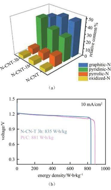 Yang等通過熱解三聚氰胺和L-半胱氨酸混合物,控制碳化溫度,制備出了高活性的氮摻雜三維石墨烯納米帶網(wǎng)絡(luò)(N-GRW),在鋅空氣電池中的開路電壓為1.46 V,峰值功率密度和比容量分別為65 mW/cm2和873 mA·h/g,具有良好的循環(huán)穩(wěn)定性,分析認(rèn)為吡啶氮結(jié)構(gòu)起主要催化作用。為了提高吡啶氮的含量,Yi等利用高錳酸鉀刻蝕空心管型聚吡咯制備了氮摻雜碳納米管,通過刻蝕碳材料引入了豐富孔結(jié)構(gòu)和缺陷,使得更多N原子處在邊緣位置,吡啶氮的含量由32.8%提升到了45.2%[圖1(a)],該催化劑在堿性條件下具有優(yōu)于商業(yè)Pt/C的半波電位(0.83 V)和穩(wěn)定性,應(yīng)用于鋅空氣電池中,顯示出122 mW/cm2的峰值功率密度和835 W·h/kg的能量密度[圖1(b)],與商業(yè)Pt/C近似。