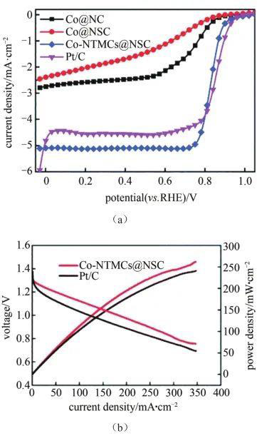 過渡金屬本身具有高催化活性,但抗氧化性能差。研究發(fā)現(xiàn),過渡金屬顆粒和碳材料復(fù)合作為ORR和OER雙功能催化劑表現(xiàn)出強(qiáng)的催化性能。在這種復(fù)合結(jié)構(gòu)中,過渡金屬可以增加碳化過程中碳材料的石墨化程度,包裹在表面的碳材料可以有效的防止金屬團(tuán)聚以確保分散,同時(shí)可以促進(jìn)電子的轉(zhuǎn)移。Zhu等通過功能聚合物的可控自組裝制備了鈷摻雜含氮和硫的多孔碳球(Co-NTMCs@NSC),Co原子均勻分布在碳球表面,提高了材料本征催化活性。測試顯示ORR半波電位為0.833V[圖2(a)],在堿性介質(zhì)中具有良好的耐甲醇能力和長期的耐用性。此外,它還表現(xiàn)出高效的OER催化活性,在10 mA/cm2下具有284 mV的過電位。用作可充電鋅空氣電池的空氣陰極時(shí),在充放電循環(huán)的12 h內(nèi)顯示出高的峰值功率密度262 mW/cm2[圖2(b)]和小的充放電電壓間隙,優(yōu)于Pt/C基空氣陰極。Ma等同樣采用高溫?zé)峤饩酆衔锓ㄖ苽淞颂技{米管包覆合金納米粒子催化劑,作為鋅空氣電池空氣陰極催化劑時(shí)顯著地提高了電池的循環(huán)穩(wěn)定性,并表現(xiàn)出高的峰值功率密度。