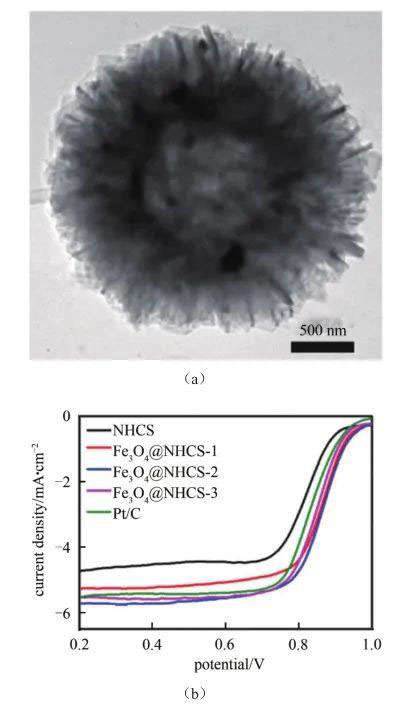 過渡金屬作為雙功能催化劑的研究與開發(fā)已經(jīng)有了很大的進(jìn)展,然而由于金屬氧化物納米顆粒的低導(dǎo)電性和團(tuán)聚性限制了其催化活性。研究發(fā)現(xiàn),通過構(gòu)建納米結(jié)構(gòu)、與碳材料復(fù)合或摻雜異質(zhì)原子等方法,可以改善過渡金屬氧化物比表面積小、導(dǎo)電性差和活性位點(diǎn)不足等問題。Cheng等通過水熱法在氮摻雜的碳材料(N-KC)上負(fù)載Co3O4納米顆粒,測試顯示半波電位為0.82 V,在0.1 mol/L KOH溶液中的極限電流密度為5.70 mA/cm2。由于Co3O4與N-KC的強(qiáng)耦合效應(yīng)和氮元素?fù)诫s的協(xié)同作用,所得到的Co3O4/N-KC納米復(fù)合材料具有顯著的催化活性。Li等以ZnO納米線為模板制備了Fe3O4與氮摻雜空心碳球復(fù)合催化劑(Fe3O4@NHCS)[圖4(a)],ORR半波電位和起始電位優(yōu)于商業(yè)Pt/C催化劑[圖4(b)]。作為鋅空氣電池陰極電催化劑時(shí),功率密度和比容量分別為133 mW/cm2和701 mA·h/g,分析發(fā)現(xiàn)高比表面積組成的空心結(jié)構(gòu)以及高活性納米顆粒與氮摻雜基體材料的協(xié)同作用是獲得高性能催化劑的主要原因。