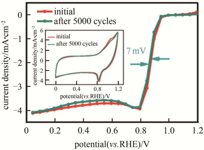 具有尖晶石結(jié)構(gòu)的混合價(jià)態(tài)過渡金屬氧化物(AB2O4)是典型的復(fù)合金屬氧化物,有著比單一金屬氧化物更靈活的結(jié)構(gòu)調(diào)控和更好的電催化性能,在堿性電解液中具有良好的耐用性。Lim等采用水熱法和氫氣還原合成了具有大量氧空位的NiCo2O4,起始電位和半波電位分別為0.93 V和0.78 V,具有優(yōu)異的耐用性和耐甲醇性。分析發(fā)現(xiàn)催化劑活性和穩(wěn)定性的提高,可以歸因于大的電化學(xué)比表面積、更多暴露的活性中心和豐富的氧空位所產(chǎn)生的良好導(dǎo)電性的協(xié)同作用。Ge等采用液相合成法,制備了由空心NiCo2O4納米球和N摻雜碳納米網(wǎng)組成的新型雙功能電催化劑(NiCo2O4@N-CNWs)。摻雜N的納米碳網(wǎng)主要有助于氧還原反應(yīng)的高活性,而NiCo2O4納米球則是氧析出反應(yīng)的活性相,NiCo2O4與N摻雜碳納米網(wǎng)的協(xié)同作用提高了其電催化性能,作為鋅空氣電池陰極催化劑時(shí)表現(xiàn)出較低的過電位,比容量達(dá)到826.9 mA·h/g,并且在循環(huán)5000次后ORR半波電位僅損失9 mV(圖5),具有長期穩(wěn)定性。